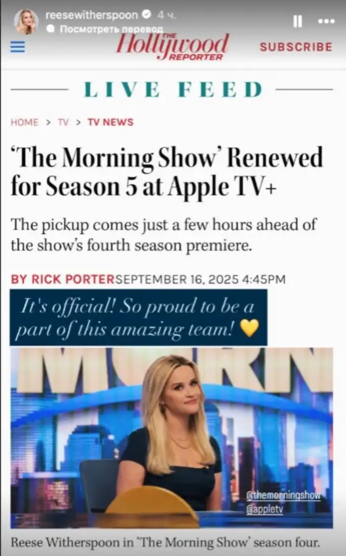 "Накануне выхода четвёртого сезона 'Утреннего шоу' Apple TV+ продлил сериал", - сообщает Hollywood Reporter.