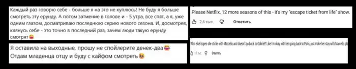 "Пожалуйста, Netflix, сделайте еще 12 сезонов этого сериала — это мое 'бегство от реальности'," — просит один из зрителей.